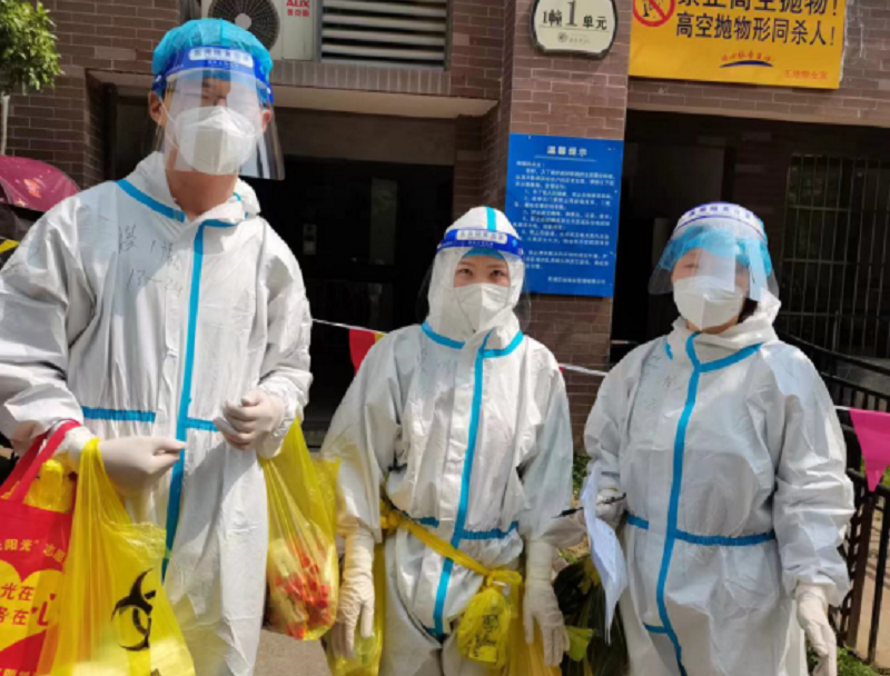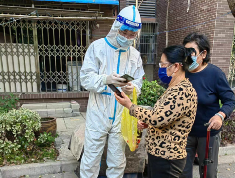 部分黨員志愿者在鏡湖區(qū)某封控社區(qū)內(nèi)對居家隔離人員進行上門核酸檢測。