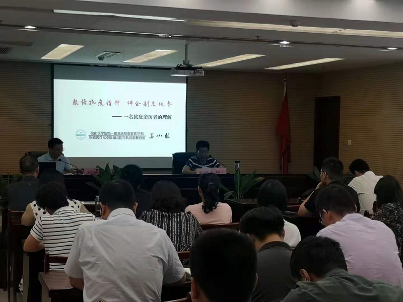 作為安徽首批援鄂醫(yī)療隊(duì)總負(fù)責(zé)人,姜小敢主任曾帶領(lǐng)團(tuán)隊(duì)分別在武漢太康醫(yī)院、協(xié)和東西湖醫(yī)院、肺科醫(yī)院開展了“疫情阻擊戰(zhàn)”、“疫情圍剿戰(zhàn)”和“疫情殲滅戰(zhàn)”。姜主任從抗疫經(jīng)歷回顧、感悟抗疫精神、體會(huì)制度優(yōu)勢(shì)等三方面回顧和分享了他馳援武漢抗擊疫情的經(jīng)歷和體會(huì)。一幅幅身臨一線的圖片、一段段飽含深情的話語,生動(dòng)再現(xiàn)了疫情發(fā)生后,全國(guó)各地醫(yī)護(hù)人員、防疫人員、共產(chǎn)黨員及社會(huì)各界不怕危險(xiǎn)、不怕犧牲,筑起防御病毒的堅(jiān)強(qiáng)堡壘的感人事跡。那一段段用生命守望生命的故事讓現(xiàn)場(chǎng)的每位聆聽者心靈都受到強(qiáng)烈震撼和感動(dòng)。